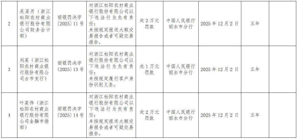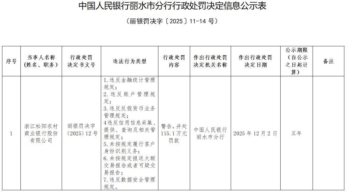 【大河财立方音信】12月11日音信,中国东谈主民银行丽水市分行日前知道的行政处罚决定信息败露,浙江松阳农村买卖银行股份有限公司被告诫,并处115.1万元罚金。